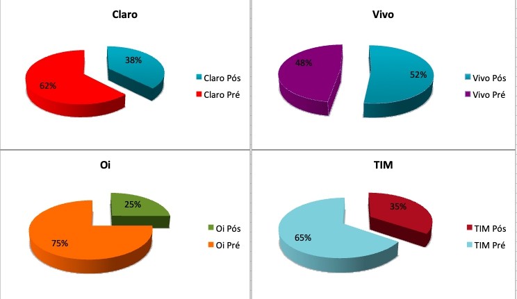 Já a Vivo inverte as posições e continua sendo a operadora com a maior base pós-paga do mercado brasileiro com 52% de todas as conexões. TIM e Claro disputam o título de maior base pré-pago com 35,945 milhões e 35,764 milhões, respectivamente.