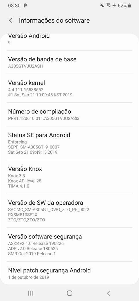 O firmware de número A305GTVJU2ASI1 está sendo disponibilizado pela empresa para os dispositivos aqui no Brasil, mas o relatório de novidades não informa sobre qualquer otimização de software além dos aprimoramentos realizados no Android, que são um padrão desse tipo de atualização.