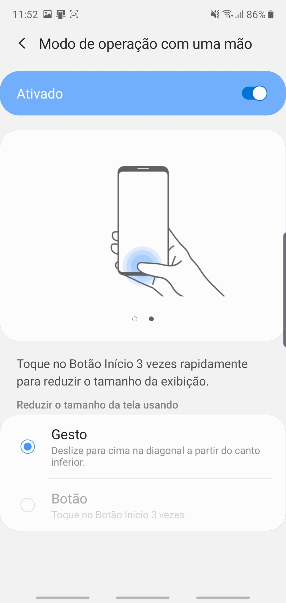 Você pode escolher dois modos de reduzir a interface. A primeira é com o gesto ao deslizar de um dos cantos na diagonal na tela; a segunda é tocar três vezes no botão início. Com o tamanho de tela reduzido, você pode alcançar qualquer parte do sistema com seu polegar seja você canhoto ou destro, já que é possível escolher que lado da tela a interface deve ficar. Para sair deste modo, toque em qualquer parte da área em preto.