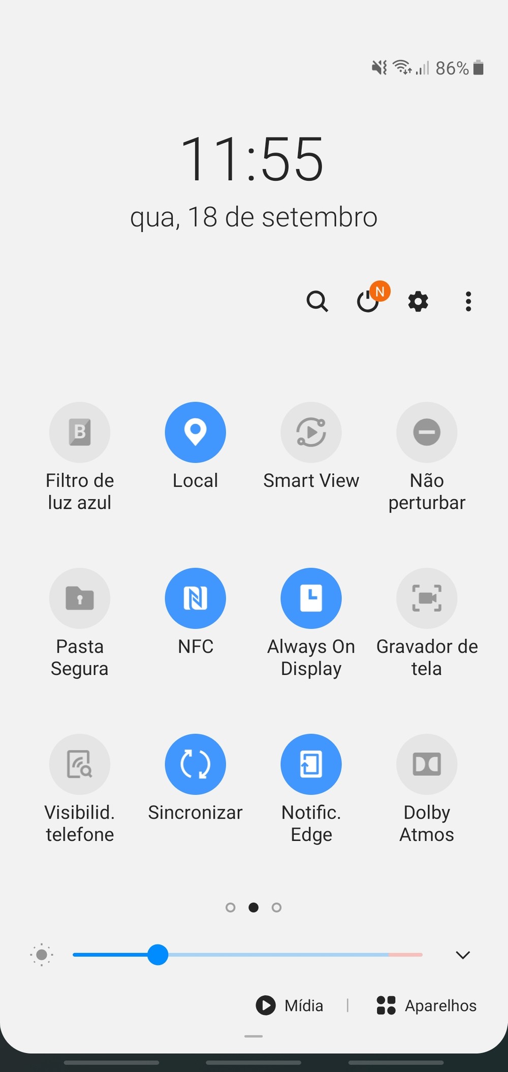 Por padrão, o Note 10 não exibe a porcentagem da bateria ao lado do ícone na barra de status. Para saber exatamente quanto você tem de carga é preciso puxar a tela de notificações e então o valor será exibido no canto superior direito.