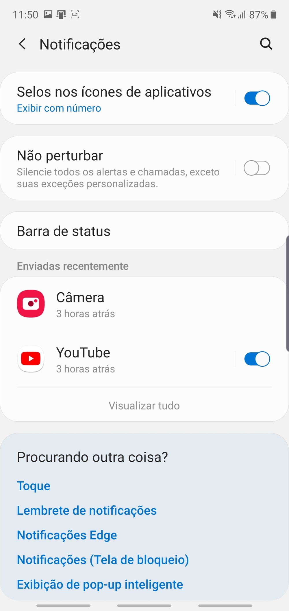 Você pode mudar isso ao tocar em opções (os três pontos aqui no canto) e selecionar a opção Barra de Status. Nesta tela basta marcar Exibir Porcentagem da Bateria e pronto. Agora você pode acompanhar a carga do aparelho de qualquer tela que estiver.
