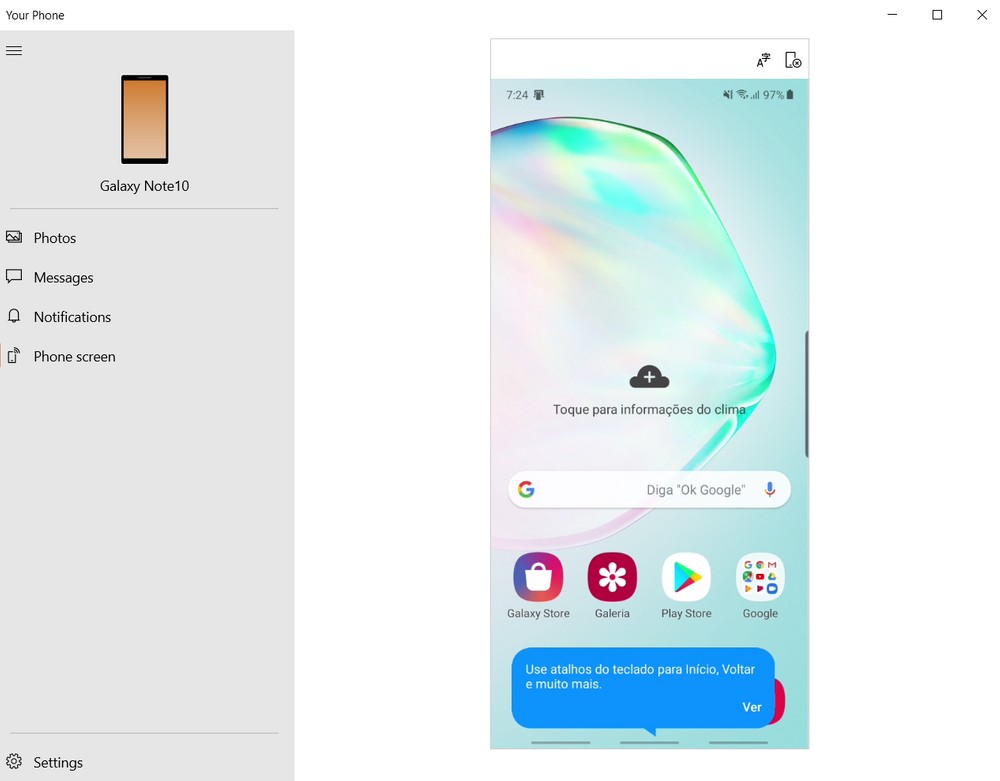 Para isso basta acessar a Windows Store e instalar o aplicativo “Seu Telefone” em seu computador e ter os dois dispositivos conectados na mesma rede. Você pode fazer isso com outros celulares, mas o grande destaque do Note 10 é poder usar o celular através do PC usando mouse e teclado.