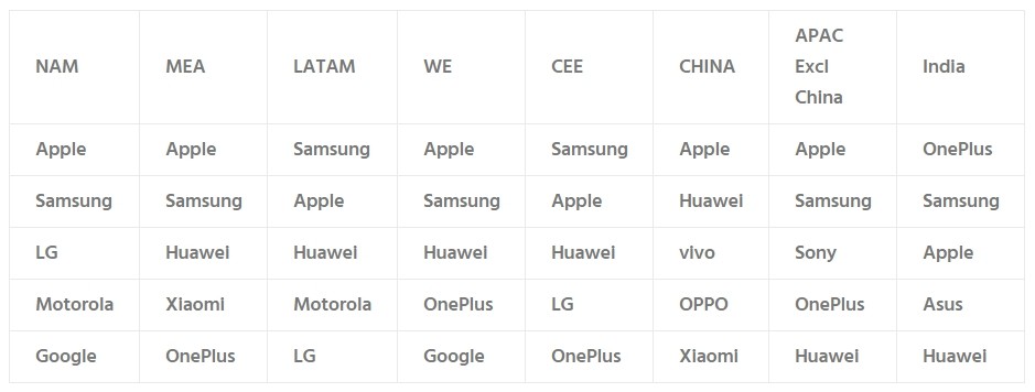 Nesse, é possível ver que Apple e Samsung estão presentes em praticamente todas as regiões no topo da lista, com exclusão da China, onde a Samsung é substituída pela Huawei e a Índia, onde a OnePlus ocupa o topo da lista, junto com a Samsung, jogando a Apple para o terceiro lugar.