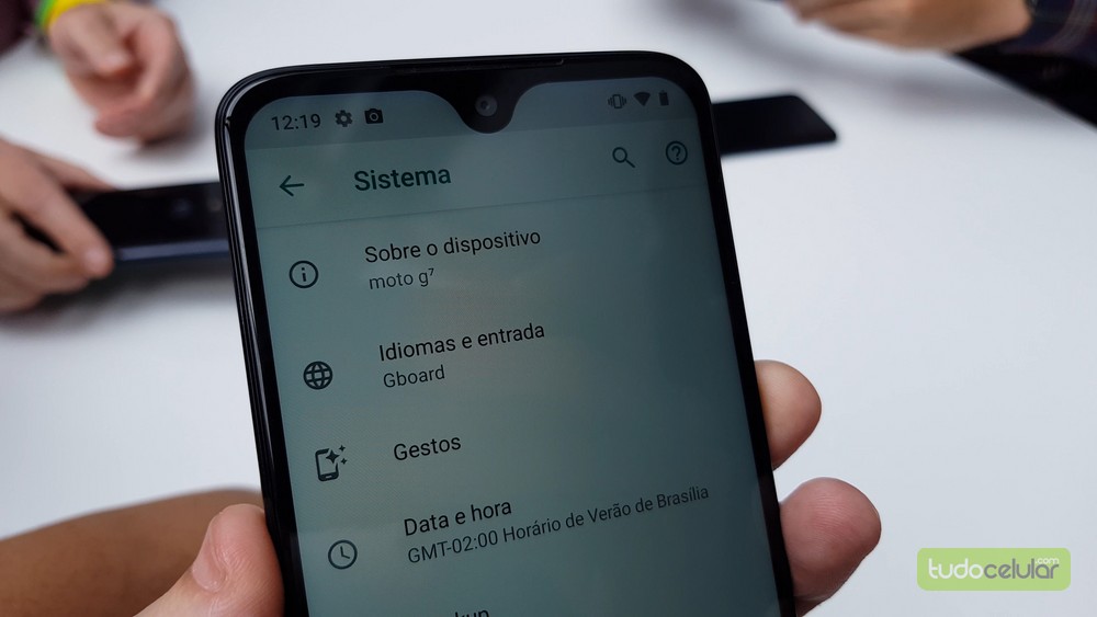 O Moto G7 segue as linhas Motorola, com boa redução das bordas em relação aos antecessores, mas ainda com proporção menor que concorrentes. Esse modelo também traz o recorte em gota para a câmera frontal e, na traseira, as câmeras ficam no círculo que se tornou assinatura da fabricante nos últimos anos.