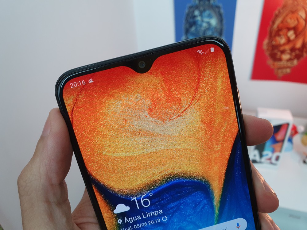 A linha A da Samsung segue um mesmo padrão em design, sempre mantendo um ótimo aproveitamento da parte frontal para a tela, com o recorte em gota para a câmera frontal, e a câmera, no caso do A20, um conjunto duplo, posicionada no canto.