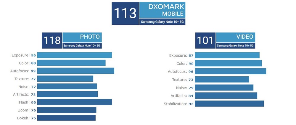 Ainda assim, com sua extrema pontuação de 113 para câmera traseira e 99 para selfies, o Galaxy Note 10 5G é o melhor smartphone para fotografias de acordo com o DxOMark.