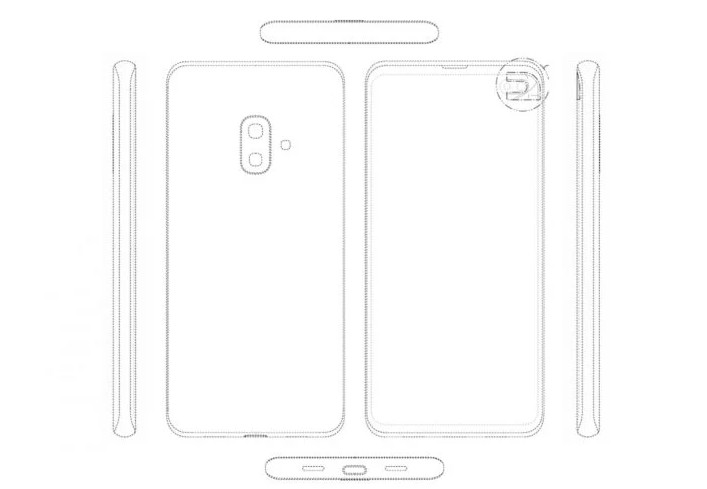 Isso porque a parte frontal traz o furo na tela para acomodar as duas câmeras, algo que é uma marca do S10 Plus. No entanto, quando olhamos a traseira, temos duas câmeras centralizadas e isso lembra muito o S9 Plus. Veja o esboço da patente abaixo: