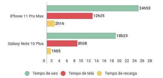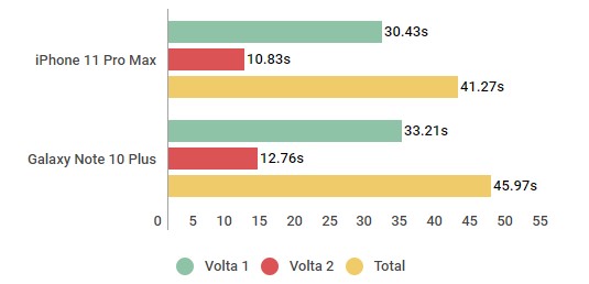 Mas e o tempo de recarga? Este era outro ponto que Apple ainda pecava muito. A empresa finalmente incluiu um carregador mais potente na caixa que reduziu bastante o tempo de espera. Porém, aqui o Galaxy Note 10 Plus leva vantagem por passar metade do tempo na tomada.