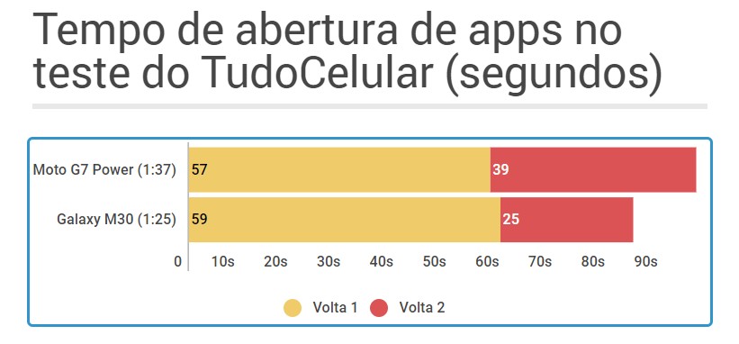 No papel, o hardware é equivalente. Mas é usando o aparelho que a gente sabe se ele realmente entrega o que promete nos benchmarks. O M30 realmente foi mais veloz em nosso teste de abertura de aplicativos, com uma vantagem de mais de 10 segundos no tempo total.