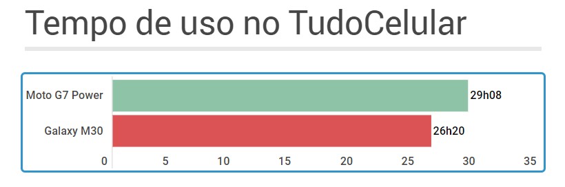 O Moto G7 Power detém o título de smartphone com o melhor tempo de duração no teste de bateria do TudoCelular. Apesar de trazer a mesma capacidade, o Galaxy M30 aguentou tempo inferior, apesar da tecnologia da tela mais econômica.